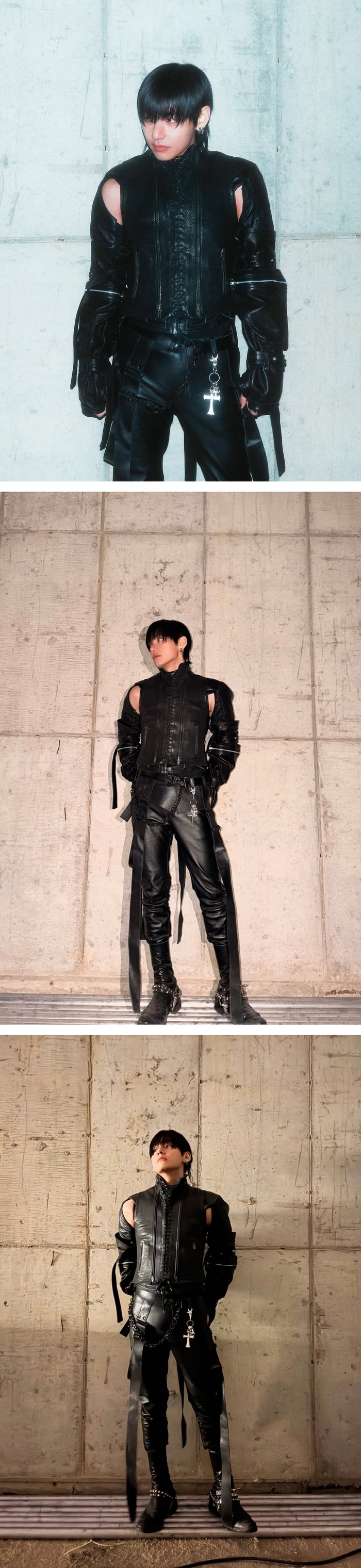 뷔는 전신을 감싸는 가죽 스타일링에 배트맨을 연상시키는 마스크를 더했다. 벽을 배경으로 한 전신 컷에서는 큰 키와 넓은 어깨, 단단한 피지컬이 강조된다. 흑발 생머리는 가죽 의상과 대비를 이루며 독특한 분위기를 만든다.