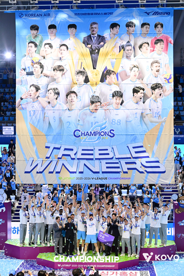 대한항공은 2022~2023시즌 이후 3년 만에 ‘트레블’(3관왕)에 성공했고, 지난시즌 현대캐피탈에 빼앗긴 ‘왕좌’도 2년 만에 빼앗았다.