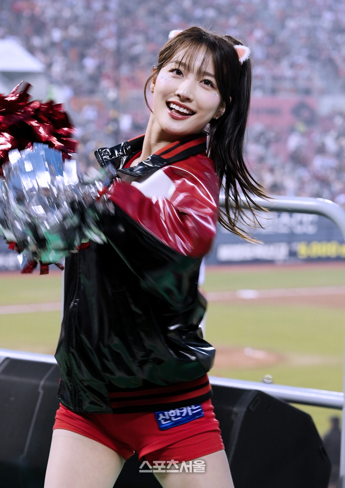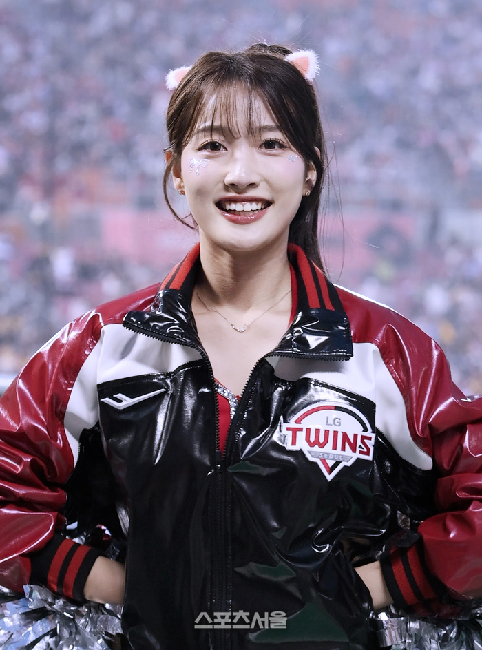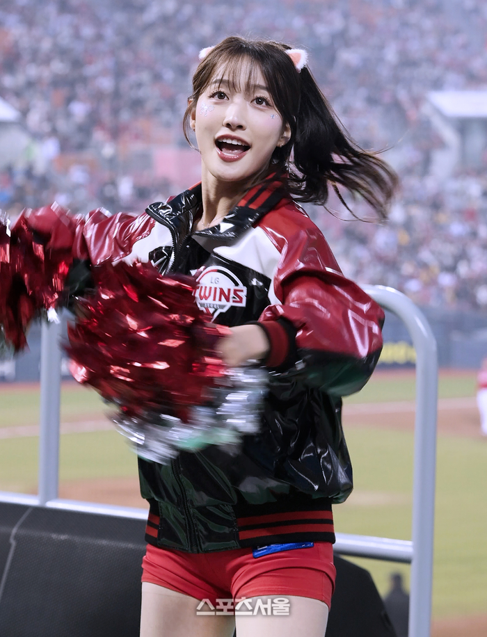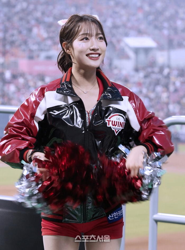 ‘2026 프로야구’ LG 트윈스와 SSG 랜더스의 잠실 경기에서 LG 치어리더 김태희가 홍창기 타석 때 ‘안타, 홈런 등’ 응원을 유도하고 있다. LG 신입 치어리더 ‘2005년 생’ 김태희는 건국대 재학생이며 아이돌 연습생 출신으로 알려졌다.