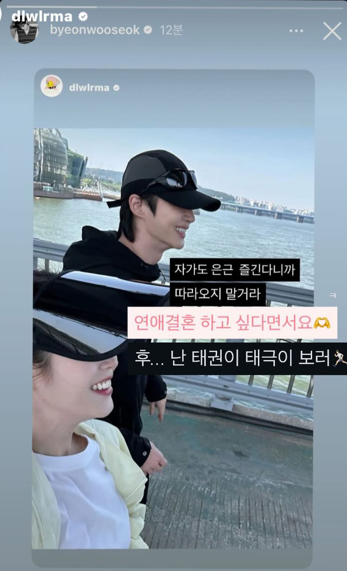 아이유가 조깅 사진과 함께 “자가도 은근 즐긴다니까”라는 문구를 남기자, 변우석은 “따라오지 말거라”라고 응수하며 차가운 ‘이안대군’의 면모를 보였다.