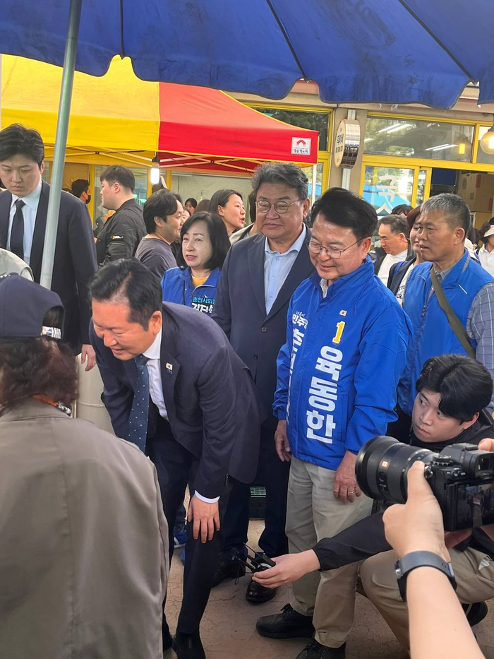 [스포츠서울ㅣ춘천=김기원 기자]육동한 더불어민주당 춘천시장 예비후보가 12일 오후 정청래 대표 및 도·시의원 출마자들과 함께 춘천 풍물시장에서 상인과 시민들을 만나 민심을 청취했다.