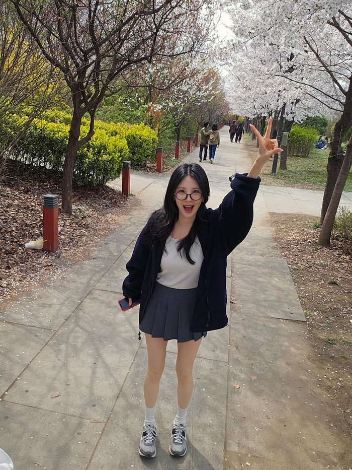 그는 활동성이 좋은 블랙 플리스 재킷에 그레이 컬러의 플리츠 미니스커트를 매치해 발랄한 분위기를 자아냈다. 여기에 검정 뿔테 안경을 착용해 지적인 이미지를 더하는가 하면, 장난기 가득한 ‘브이(V)’ 포즈로 특유의 밝은 에너지를 드러냈다.