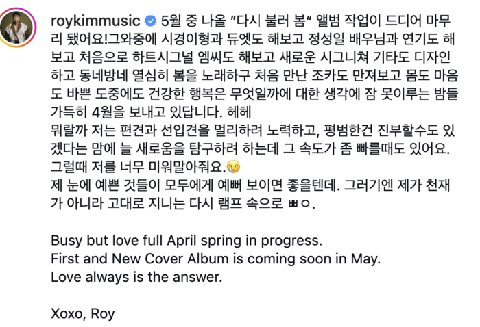 로이킴은 12일 자신의 SNS를 통해 새 앨범 ‘다시 불러 봄’의 작업 마무리 소식을 전하며, 4월 한 달간 이어온 밀도 높은 활동 근황을 공개했다.