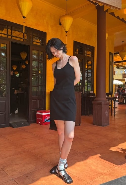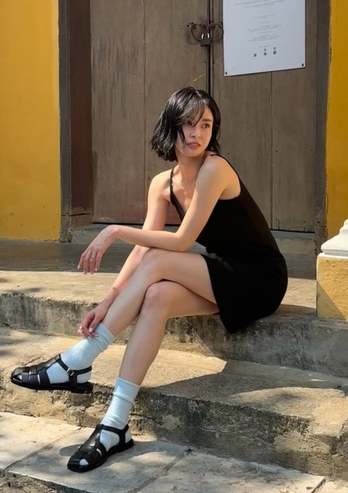 스타일링도 시선을 붙든다. 블랙 원피스에 민트색 양말, 샌들을 매치한 조합은 단조롭지 않으면서도 권나라만의 감각을 보여준다.