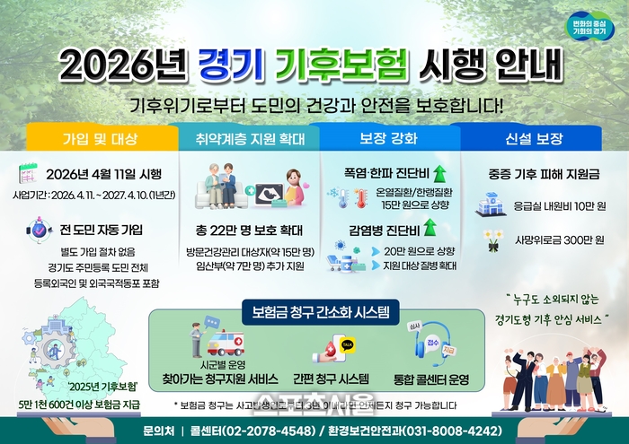 경기 기후보험은 도에 주민등록을 둔 도민이라면 등록외국인과 외국국적동포를 포함해 누구나 별도의 절차 없이 자동으로 가입된다. 나아가 보험금을 몰라서 못 받거나 청구 과정이 번거로워 포기하는 도민이 없도록 청구 시스템을 대대적으로 개편했다.