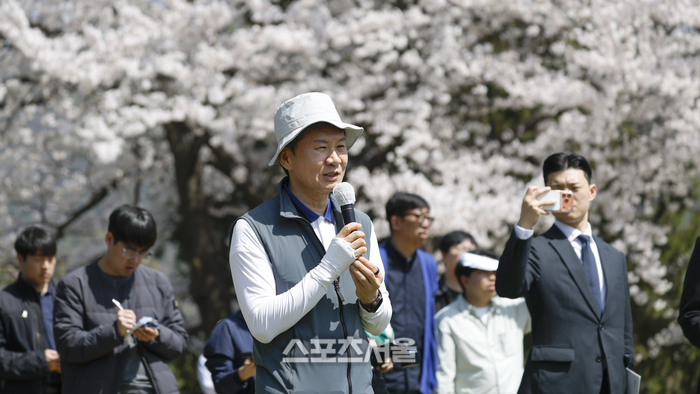 정몽규 대한축구협회장이 13일 경기도 용인 코리아CC에서 열린 ‘2026 축구인 골프대회’에 앞서 인사말을 하고 있다.