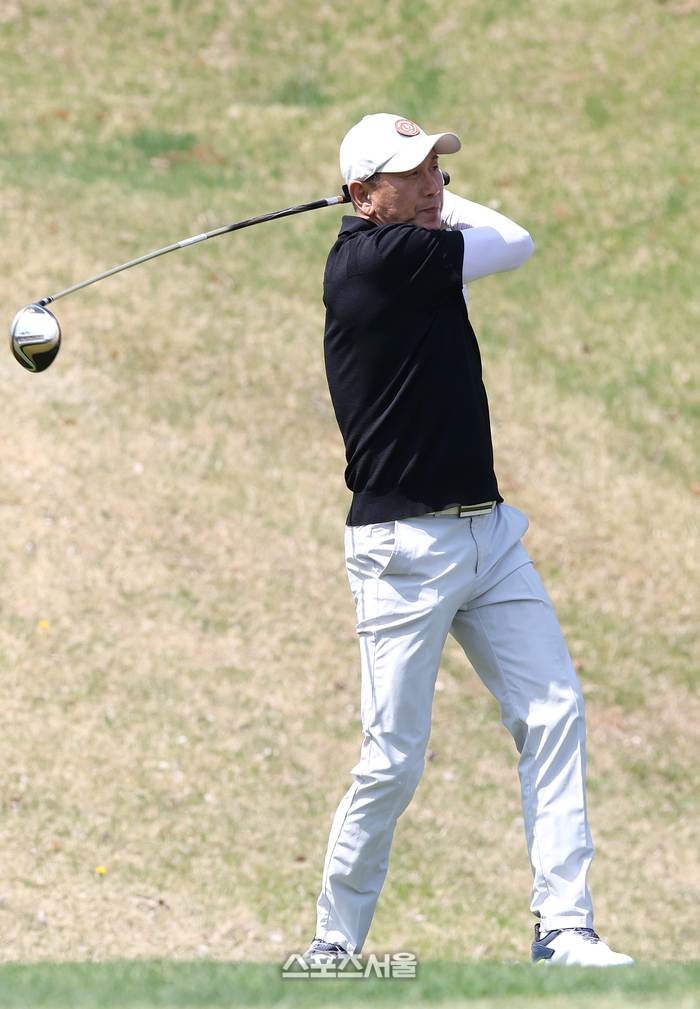 박태하 포항 스틸러스 감독이 13일 경기도 용인 코리아CC에서 열린 ‘2026 축구인 골프대회’에서 티샷을 하고 있다.
