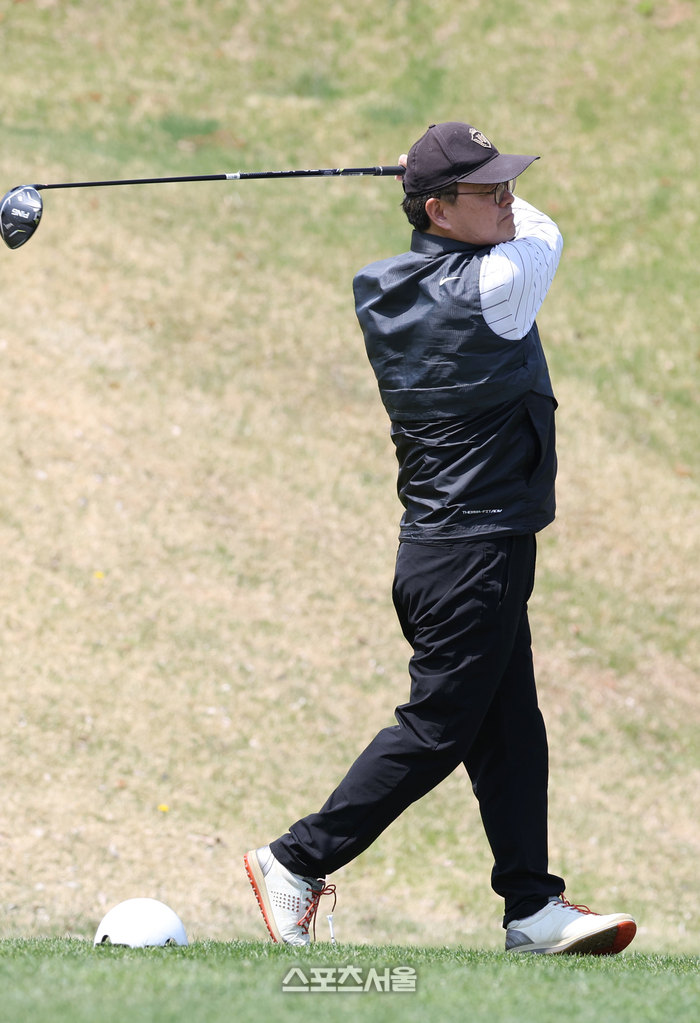 이용수 대한축구협회 부회장이 13일 경기도 용인 코리아CC에서 열린 ‘2026 축구인 골프대회’에서 티샷을 하고 있다.