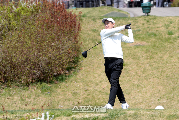 현영민 해설위원이 13일 경기도 용인 코리아CC에서 열린 ‘2026 축구인 골프대회’에서 티샷을 하고 있다.