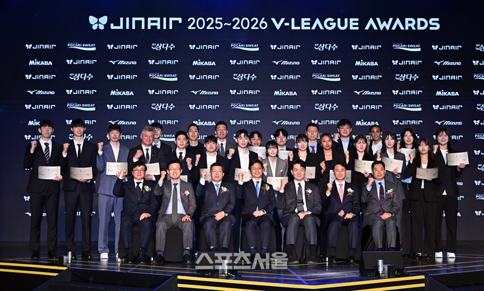 13일 서울 광진구 그랜드 워커힐 서울 비스타홀에서 진행된 진에어 2025-2026 V-리그 시상식에서 수상자와 시상자들이 기념촬영을 하고 있다. 2026. 4. 13.