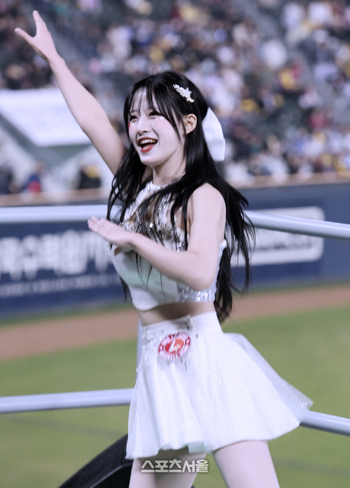 ‘2026 프로야구’ LG와 SSG의 경기 잠실, SSG 박성한 타석이 돌아오자 “박성한, 랜더스 위하여 시원하게 날려라”라는 응원곡이 울려 퍼지는 순간 안타가 터졌다. SSG 치어리더 정설아를 비롯한 응원단상은 환호의 물결로 변했다.