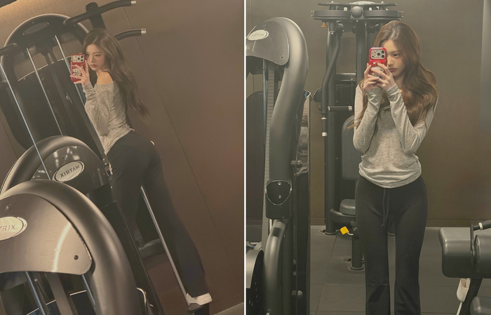 회색 롱 슬리브 상의와 검은색 부츠컷 레깅스를 매치한 장원영은 화려한 장식 없이도 탄탄한 보디라인과 남다른 비율을 선보였다.