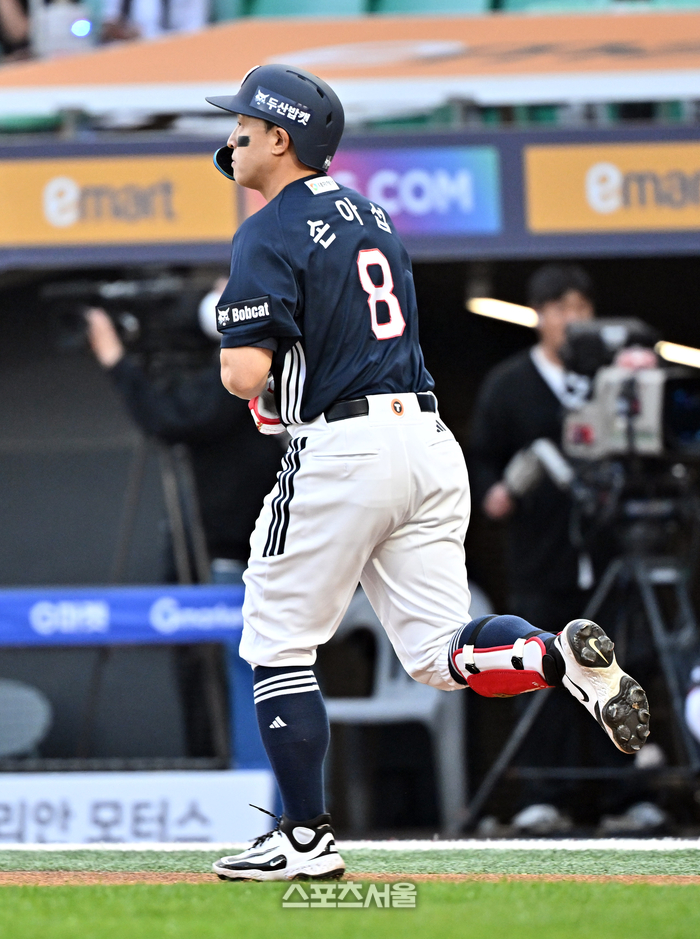 한화에서 두산으로 전격 트레이드 된 손아섭이 14일 문학구장에서 열린 2026 KBO리그 SSG와의 1회초 무사 1루 첫 타석에서 볼넷으로 출루하고 있다. 2026. 4. 14.