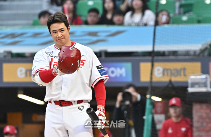 SSG 김재환이 14일 문학구장에서 열린 2026 KBO리그 두산과의 경기 1회말 무사 1루 상황에서 친정팀 두산을 처음으로 상대하면서 모자를 벗어 두산 선수들에게 인사를 하고 있다. 2026. 4. 14.