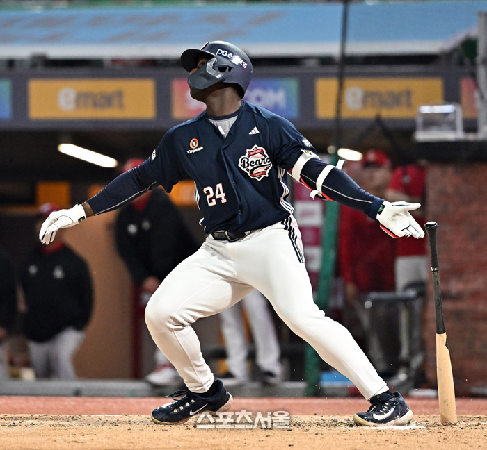 두산 카메론이 14일 문학구장에서 열린 2026 KBO리그 SSG와의 경기 4회초 2사 1루 상황에서 SSG 전영준을 상대로 2점 홈런을 치고 있다. 2026. 4. 14.