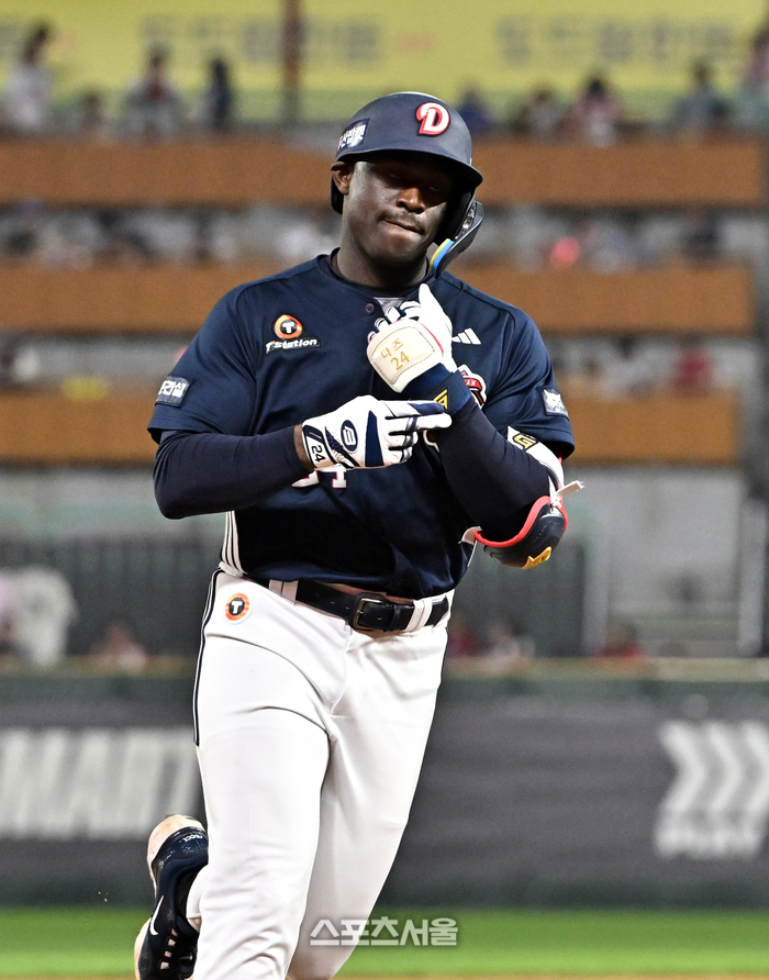 두산 카메론이 14일 문학구장에서 열린 2026 KBO리그 SSG와의 경기 4회초 2사 1루 상황에서 SSG 전영준을 상대로 2점 홈런을 친 뒤 베이스를 돌며 세리머니를 하고 있다. 2026. 4. 14.