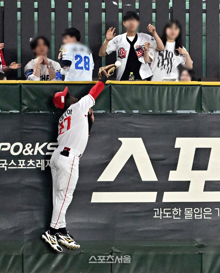 14일 문학구장에서 열린 2026 KBO리그 두산과 SSG의 경기 3회초 무사 1루 상황 두산 양의지의 타구가 SSG 중견수 에레디아의 글러브 옆으로 넘어가며 홈런이 되고 있다. 2026. 4. 14.