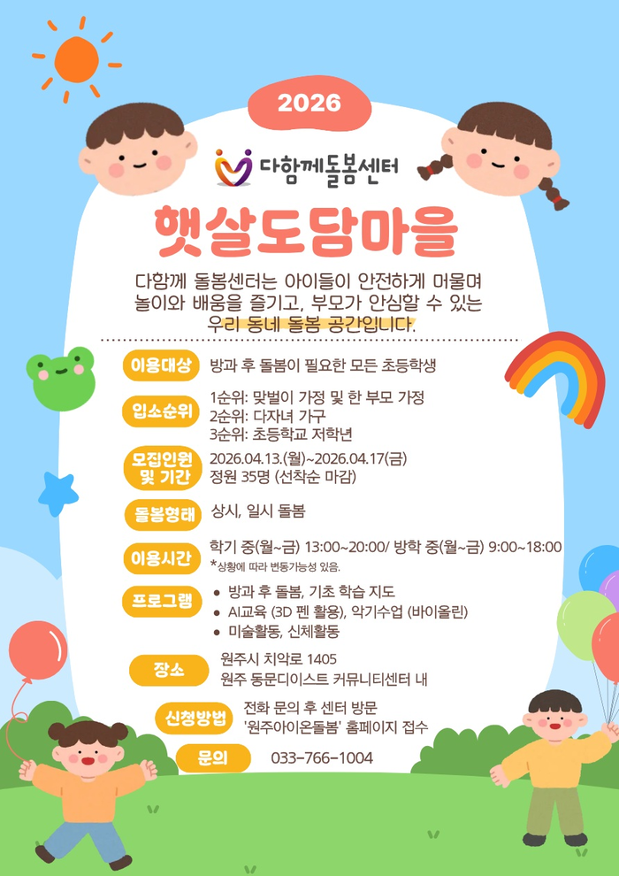 이용 신청은 원주시 아동돌봄 온라인 플랫폼 ‘원주아이온돌봄’ 홈페이지 또는 방문을 통해 가능하다. 자세한 사항은 전화(☎033-766-1004)로 문의하면 된다.