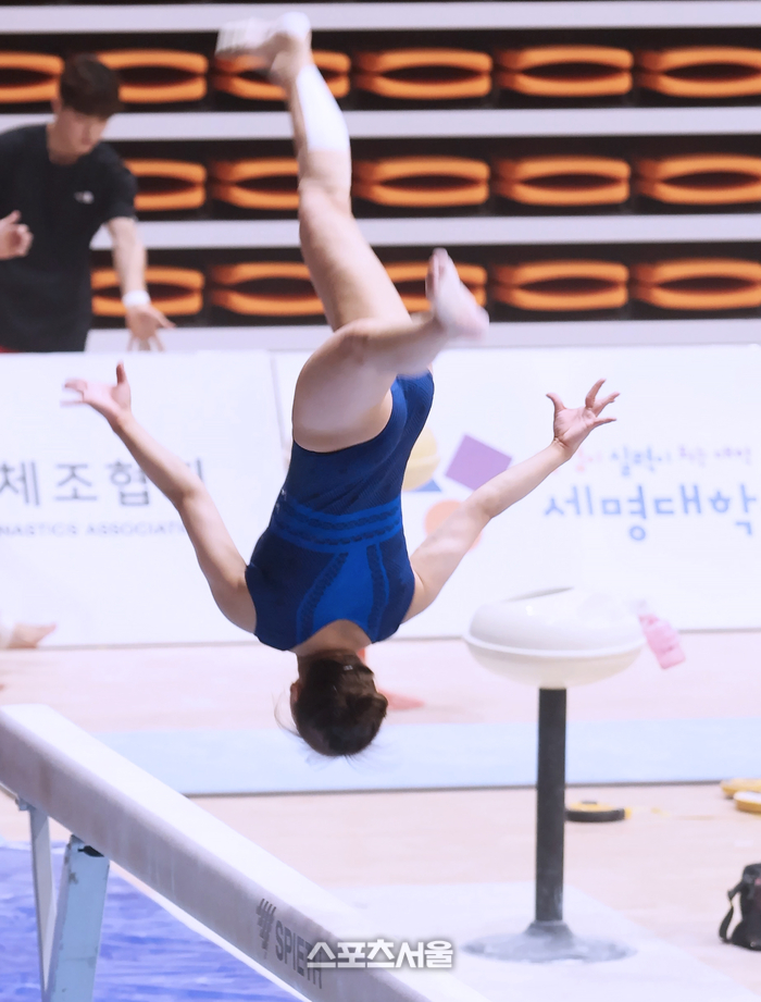 15일 오후 충청북도 제천시 제천체육관에서 ‘제81회 전국종별체조선수권대회’ 공식 연습이 진행됐다. 제천시청 여서정이 평균대 연기를 선보이고 있다.