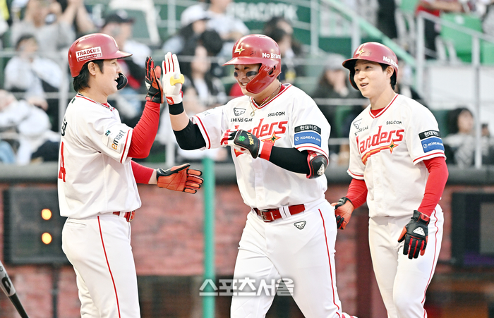 SSG 고명준(가운데)이 15일 문학구장에서 열린 2026 KBO리그 두산과의 경기 1회말 2사 2-3루 상황에서 두산 선발 이영하를 상대로 선제 3점 홈런을 친 뒤 선행주자 최정(왼쪽), 박성한과 하이파이브를 나누고 있다. 고명준의 시즌 4호 홈런. 2026. 4. 15.