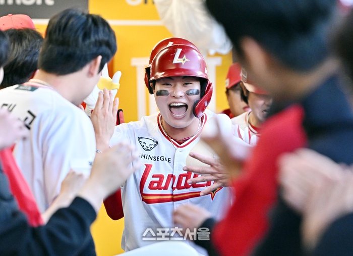 SSG 고명준이 15일 문학구장에서 열린 2026 KBO리그 두산과의 경기 1회말 2사 2-3루 상황에서 두산 선발 이영하를 상대로 선제 3점 홈런을 친 뒤 동료들과 하이파이브를 나누고 있다. 고명준의 시즌 4호 홈런. 2026. 4. 15.