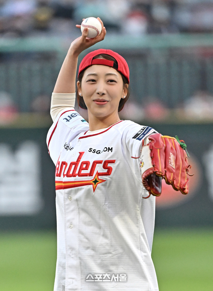 임민소 전 아나운서가 15일 문학구장에서 열린 2026 KBO리그 두산과 SSG의 경기에 앞서 프로모션 시구를 하고 있다. 임민소 아나운서는 남편인 선우철강 김태환 대표와 프로모션 시구/시타에 나섰다. 2026. 4. 15.