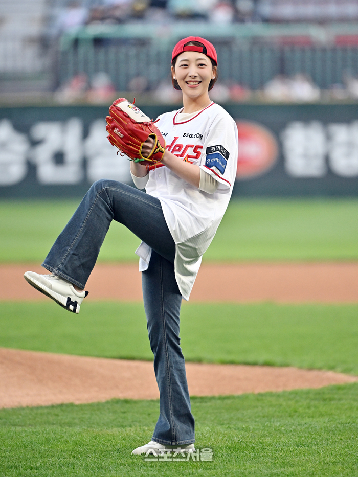 임민소 아나운서가 15일 문학구장에서 열린 2026 KBO리그 두산과 SSG의 경기에 앞서 프로모션 시구를 하고 있다. 임민소 아나운서는 남편인 선우철강 김태환 대표와 프로모션 시구/시타에 나섰다. 2026. 4. 15.