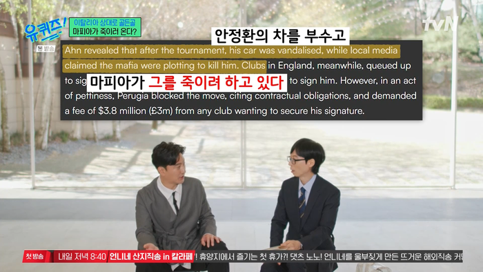 안정환의 사연을 들은 MC 유재석은 “정당하게 경기를 해서 골을 넣었는데 그런 대우를 받았다는 게 정말 이해가 안 가고 황당하다”며 분노를 표했다. 안정환은 “당시 한국 축구가 변방이었기에 그들 입장에서는 자존심이 상해 억울했을 것”이라며 담담하게 회고했다.
