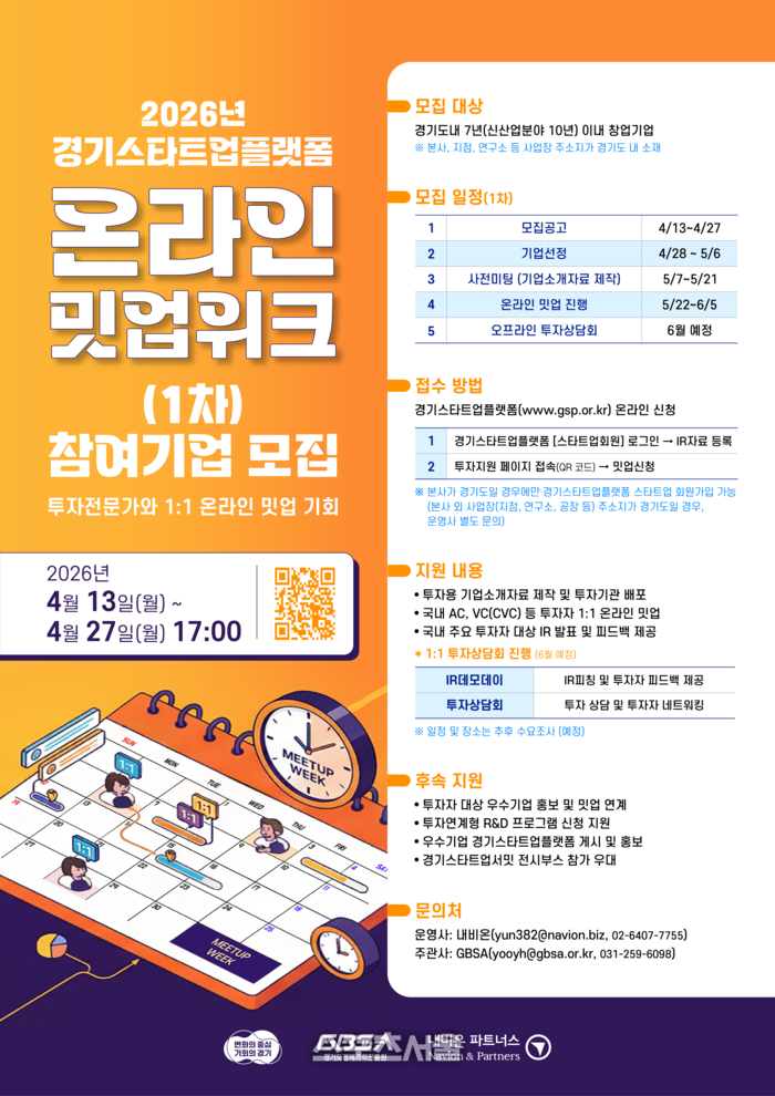신청은 경기스타트업플랫폼 홈페이지에서 공고문을 확인한 뒤, 플랫폼에 로그인해 IR 자료를 등록하고 밋업을 신청하면 된다.