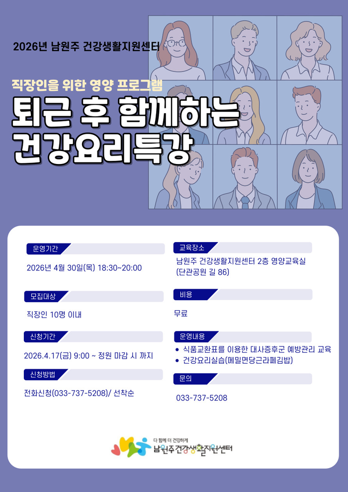 [스포츠서울ㅣ원주=김기원 기자]남원주건강생활지원센터는 직장인을 위한 영양 프로그램 ‘퇴근 후 함께하는 건강요리특강’ 참여자를 모집한다고 밝혔다.