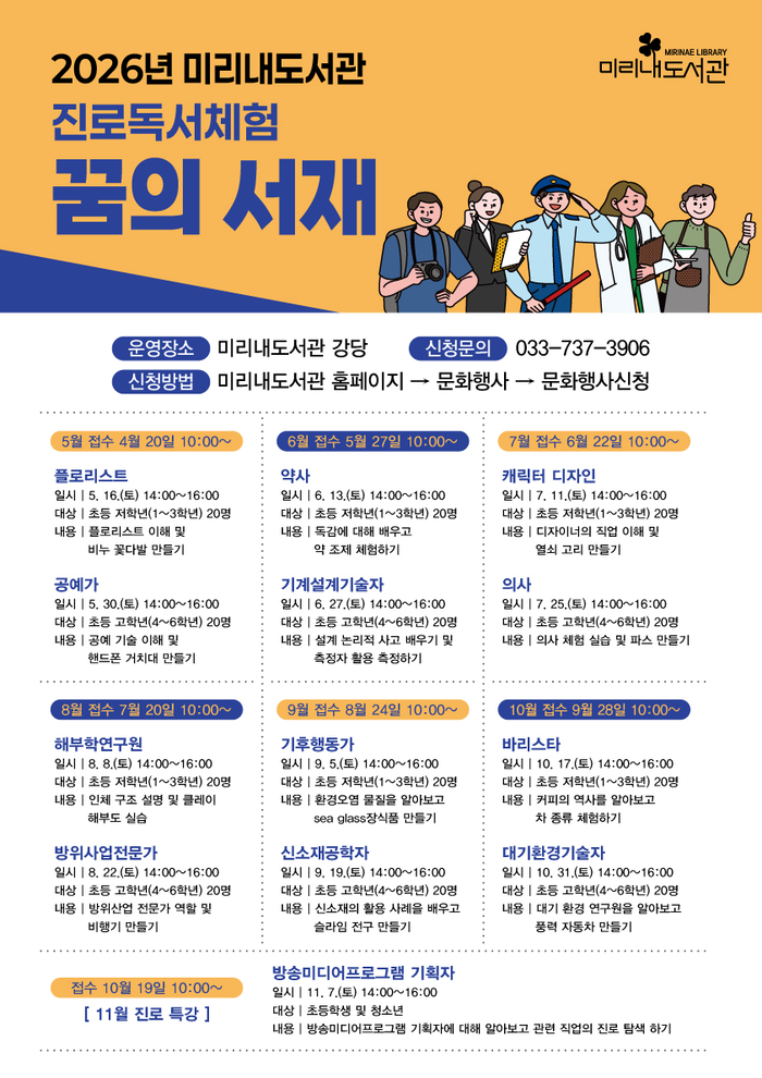 첫 회차인 5월 프로그램 신청은 4월 20일 오전 10시부터 각 도서관 홈페이지를 통해 선착순으로 접수한다. 이후에도 매월 정기적으로 참여 신청을 받을 예정이다. 자세한 사항은 미리내도서관 장서관리팀(☎033-737-3906)으로 문의하면 된다.