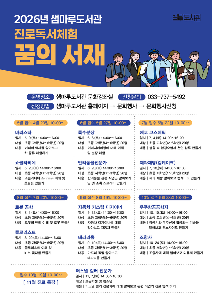 [스포츠서울ㅣ원주=김기원 기자]원주시 미리내도서관은 관내 학생들의 자기 주도적 진로 탐색을 돕기 위해 5월 9일부터 11월 7일까지 미리내도서관과 샘마루도서관에서 진로 독서 체험 프로그램 ‘꿈의 서재’를 운영한다고 밝혔다.