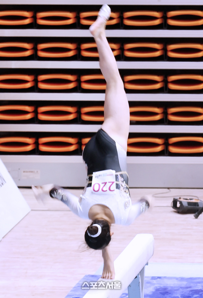 ‘제81회 전국종별체조선수권대회’ 첫째날 여자일반부 평균대 제1경기에서 강원특별자치도 엄도현이 환상의 연기를 펼치고 있다. 엄도현이 13.300으로 이 부문 1위를 질주하고 있다. 제천시청 임수민(13.267) 2위, 여서정(12.767) 3위.