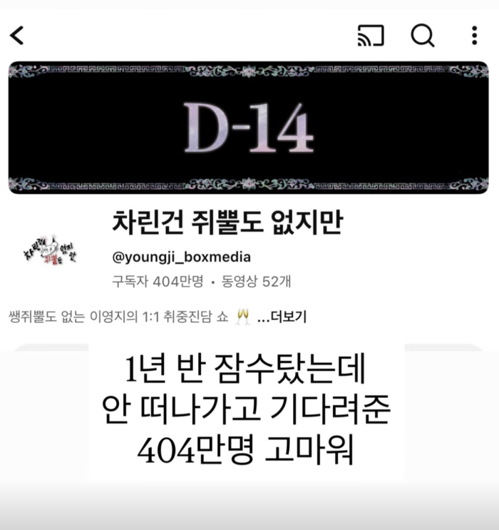 그러면서 “1년 반 잠수 탔는데 안 떠나가고 기다려준 404만 명 고마워”라며 구독자들에게 감사함을 전했다.