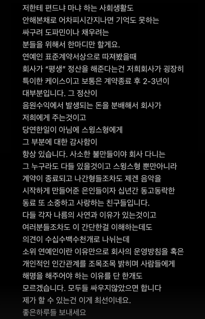 그러면서 “누구나 회사에 다니며 사소한 불만은 있을 것이다. 스위스형뿐만 아니라 계약이 종료되고 나간 형들도 모두 은인, 동료, 소중하고 사랑하는 친구들”이라고 전했다.