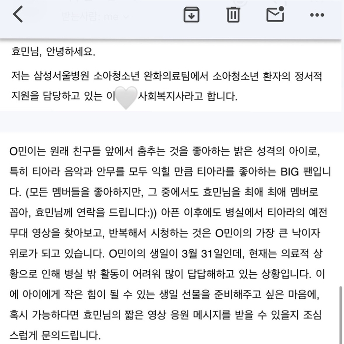 효민은 17일 자신의 SNS를 통해 삼성서울병원 소아청소년 완화의료팀으로부터 받은 한 통의 메일 내용을 공개하며 오랜 팬과의 특별한 만남을 가졌다.