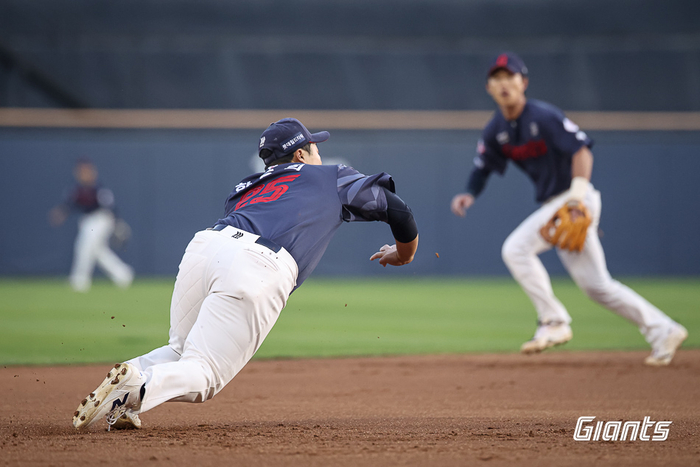 지난 15일 잠실 LG전이 대표적이다. 1회말 2사 상대 타자 오스틴 딘의 강한 타구가 3루 쪽으로 날아왔다. 한동희가 재빠르게 몸을 날려 이 타구를 잡아냈다. 넘어진 상황에서 송구했지만, 이게 1루까지 배달되지는 못했다. 아웃카운트가 올라가지는 않았다. 그래도 김 감독도 이 장면을 인상 깊게 봤다.