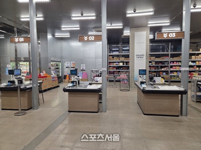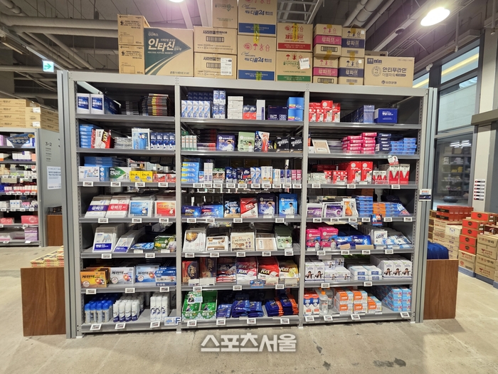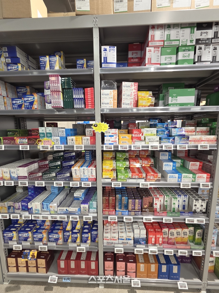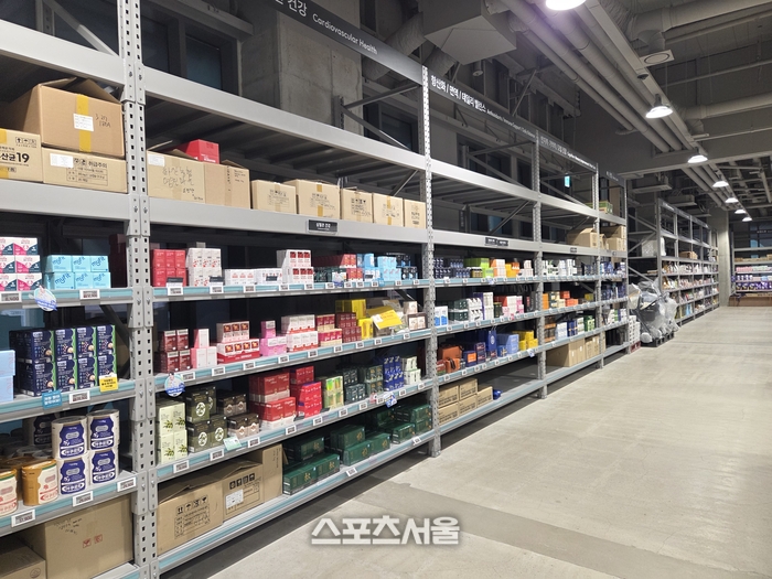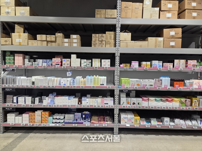 매장 내부는 널찍한 통로를 사이에 두고 번호가 매겨진 계산대가 나란히 배치돼 코스트코나 이마트 트레이더스 같은 창고형 할인매장을 연상케 한다. 진열대에는 각종 뷰티 제품부터 어린이용 영양제, 상비약, 파스류가 박스 단위로 촘촘히 진열돼 압도적인 규모감을 자랑한다.