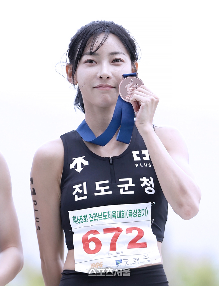 예능프로그램 ‘솔로지옥5’에서 인상적인 장면을 연출했던 ‘육상 카리나’ 김민지(진도군청)가 지난 11일 전라남도 구례군 구례공설운동장에서 펼쳐진 ‘제65회 전라남도체육대회(이하 전남체전)’ 육상 여자일반부 200m 결승에서 27초51로 3위, 동메달을 목에 걸고 있다. 광양시 이하은(25초95) 1위, 여수시 신규리(26초37) 2위.