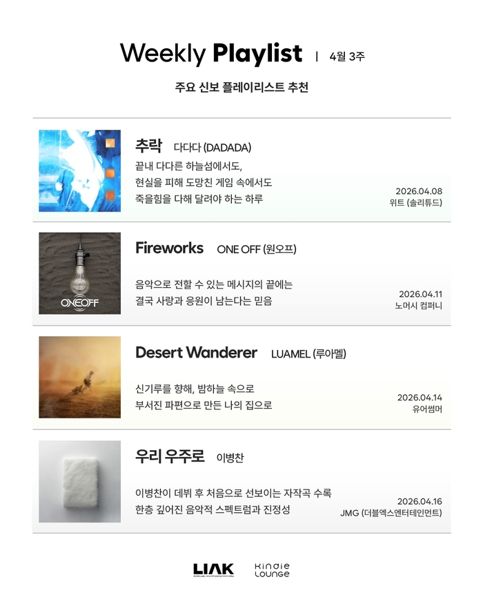 [스포츠서울 | 이승록 기자] 한국음악레이블산업협회(음레협)가 운영하는 킨디라운지가 4월에 발표된 주요 신보 네 편을 선정해 소개했다. 이번에 소개된 작품들은 현실과 이상, 위로와 몽환 등 다양한 감정을 담아낸 것이 특징이다.