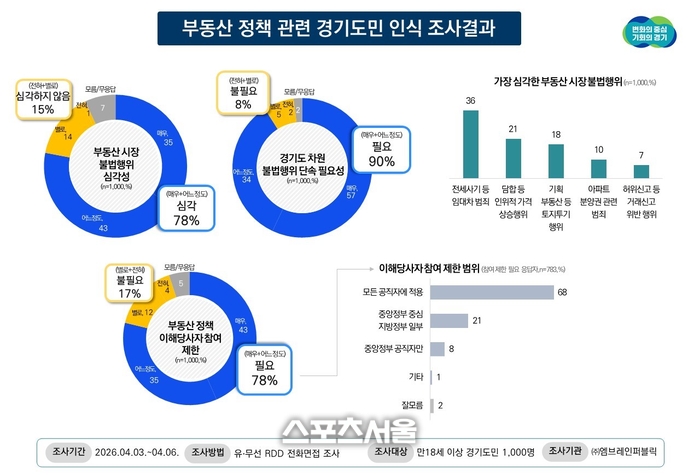 〔스포츠서울│수원=좌승훈기자〕경기도민 10명 중 8명이 현재 부동산 시장의 불법행위를 심각하게 인식하고 있으며 단속 강화 필요성에는 9명이 공감한다는 조사결과가 나왔다.