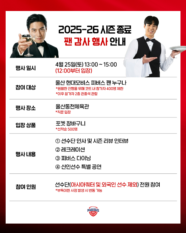 현대모비스는 “25일 2025-2026시즌을 마무리하며 팬 감사 행사를 진행한다”고 21일 밝혔다.