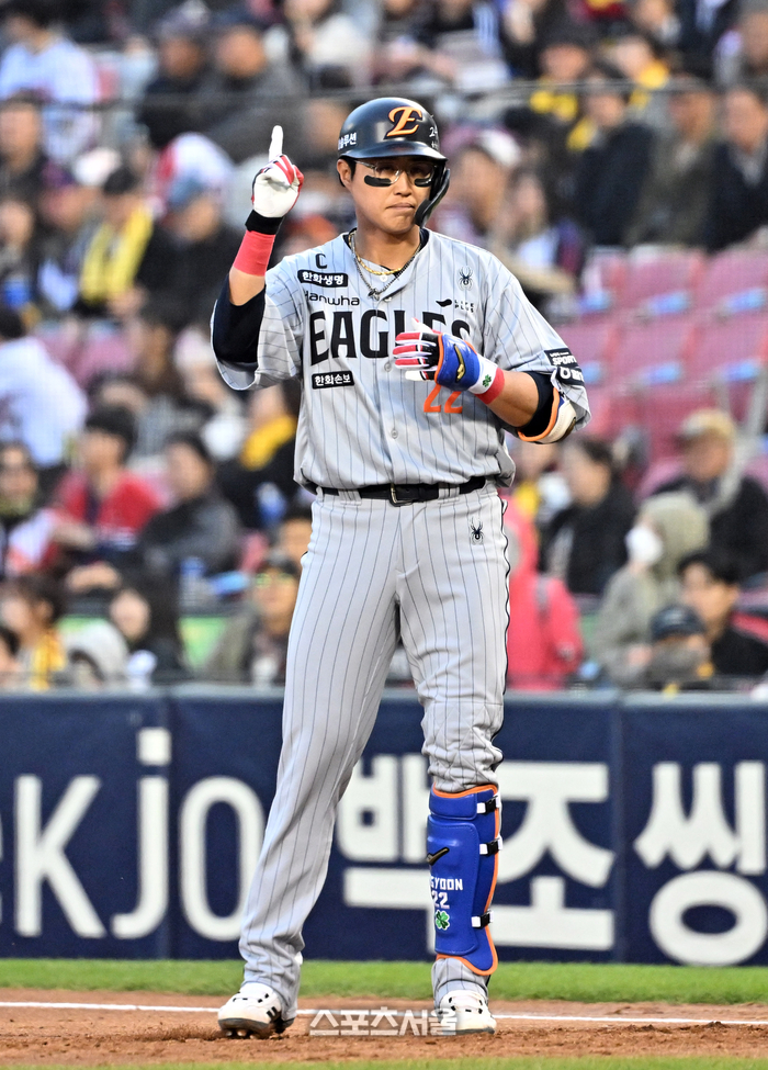 한화 채은성이 21일 잠실구장에서 열린 2026 KBO리그 LG와의 경기 2회초 무사 LG 선발 송승기를 상대로 안타를 친 뒤 세리머니를 하고 있다. 2026. 4. 21.