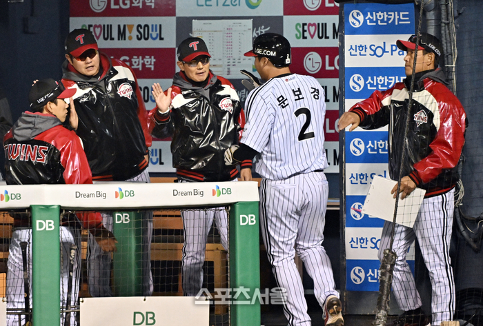 LG 염경엽 감독(가운데)이 21일 잠실구장에서 열린 2026 KBO리그 한화와의 경기 4회말 1사 만루 상황에서 상대 폭투에 홈을 밟은 문보경과 하이파이브를 나누고 있다. 2026. 4. 21.