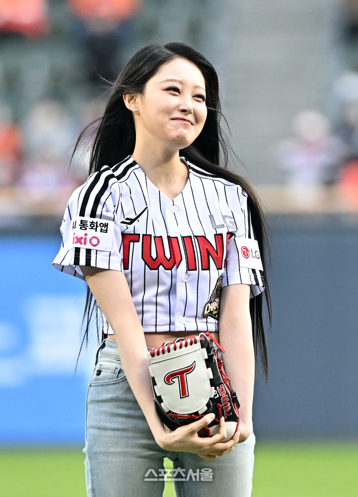 세이마이네임의 소하가 21일 잠실구장에서 열린 2026 KBO리그 한화와 LG의 경기에 앞서 시구를 한 뒤 바닥으로 향한 투구에 아쉬워하고 있다. 시타는 세이마이네임의 준휘가 맡았다. 2026. 4. 21.
