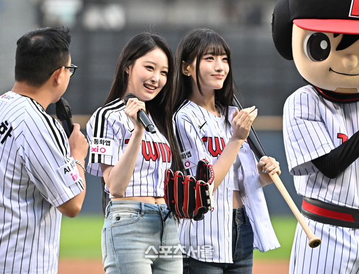 세이마이네임의 소하(왼쪽)와 준휘가 21일 잠실구장에서 열린 2026 KBO리그 한화와 LG의 경기에 앞서 시구와 시타를 하기 전 인사말을 하고 있다. 2026. 4. 21.