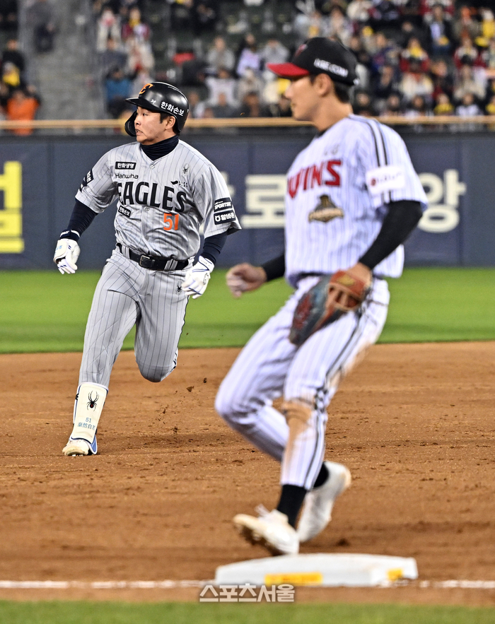 한화 문현빈이 21일 잠실구장에서 열린 2026 KBO리그 LG와의 경기 5회초 2사 2루 상황에서 LG 송승기를 상대로 1타점 3루타를 친 뒤 베이스를 향해 달리고 있다. 2026. 4. 21.