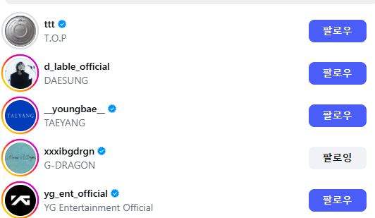 특히 이 계정이 전 멤버 탑(T.O.P)의 개인 계정을 팔로우한 사실이 알려지며, 향후 완전체 활동 가능성에 대한 기대감도 커지고 있다.