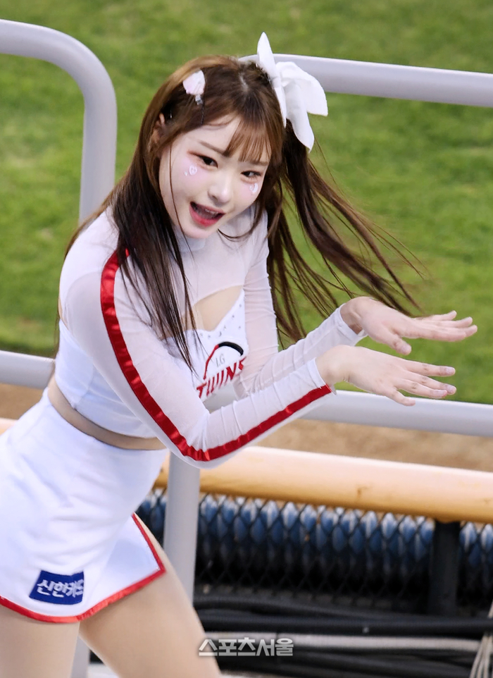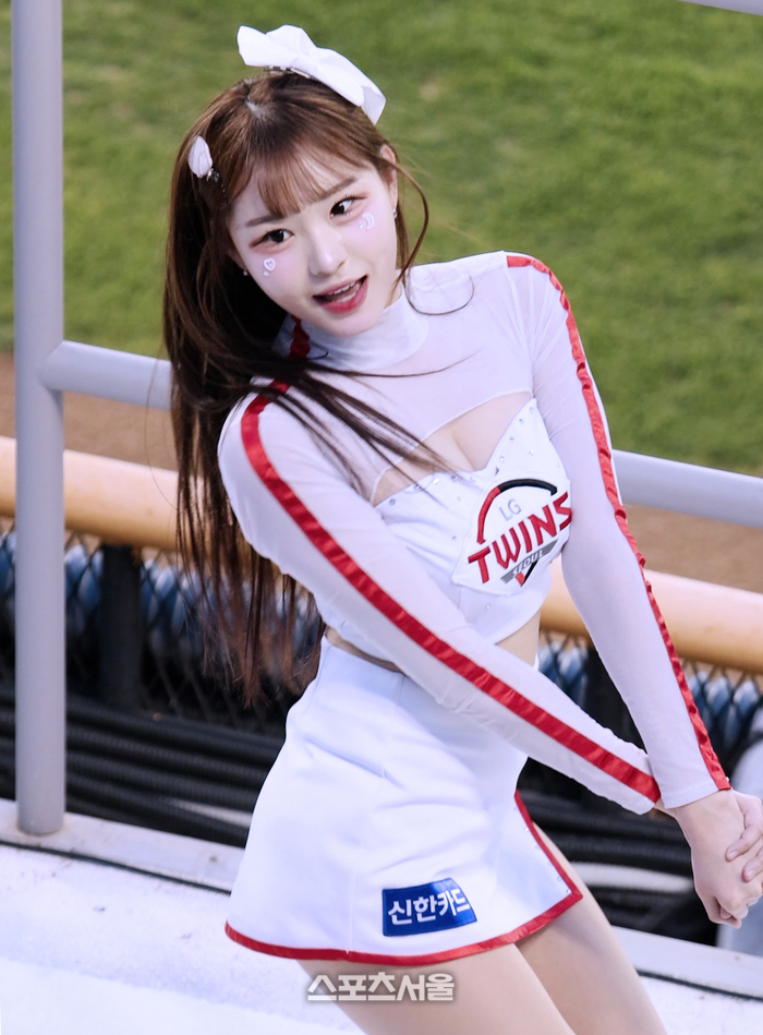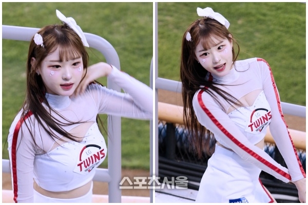 ‘2026 프로야구’ LG 트윈스와 한화 이글스의 경기가 한창 진행 중인 잠실구장 외야. 전광판에서 가까운 곳이니 내야에서 먼 곳이라 할 수 있겠다. LG는 외야에도 응원단을 파견했다. 응원 부단장 1명과 치어리더 2명이 그 주인공들. 마치 토끼 소녀처럼 귀엽고 깜찍한 LG 치어리더 신서윤은 그곳에서 야구팬들과 함께 응원 중이었다. 안무 공연도 내야와 마찬가지로 펼쳐졌다.