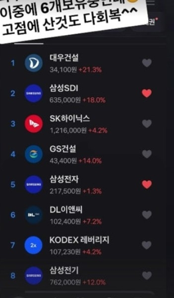 미나는 전날인 21일 자신의 소셜미디어(SNS)에 “와우~ 이 중에 6개 보유 중인데 고점에서 산것도 다 회복”이라는 문구와 함께 주식 현황을 담은 이미지를 공개했다. 몇몇 종목 옆에 하트 표기를 남겨 관심 종목임을 나타냈다.